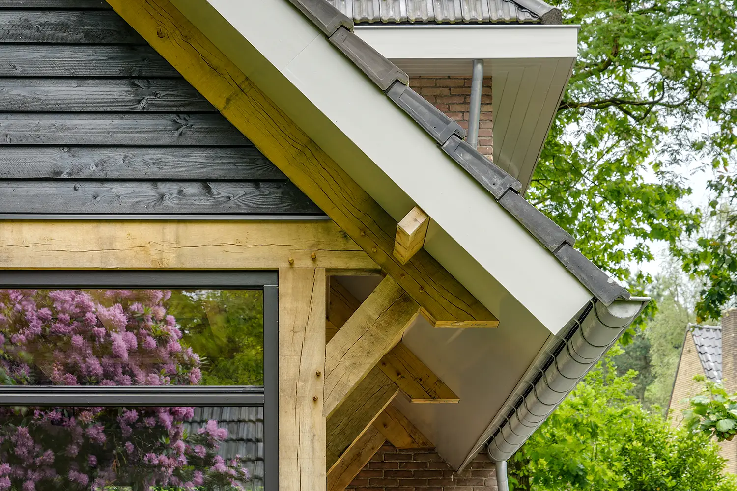 De woning is uitgebreid met een stijlvolle uitbouw, uitgevoerd in een authentieke eikenhouten spantconstructie. Deze constructie vormt zowel binnen als buiten een opvallend architectonisch element, met ambachtelijk vakmanschap zichtbaar in de houten verbindingen.